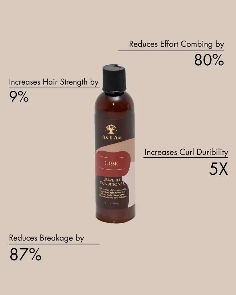 • A great leave-in is a vital first step in styling. Use the As I Am® Leave-In Conditioner after cleansing and conditioning. Your finished style will be softer, shinier and more manageable.